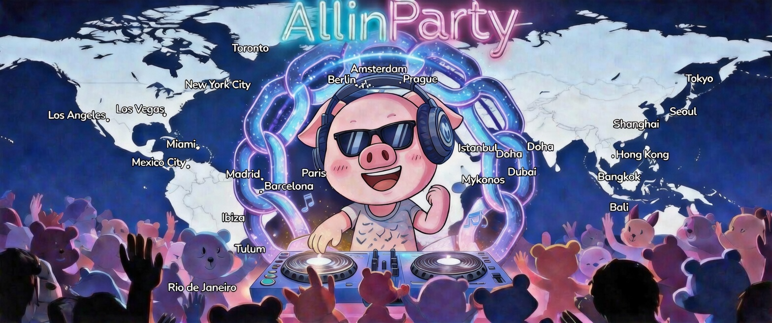 The All-in Party is more than just a party; it's a never-ending global Web3 family. We'll be hosting offline events in top music venues worldwide, creating unique experiences for the cryptocurrency and Web3 community: live performances by top DJs, social interaction, generous airdrop rewards, and surprise perks. Here, you'll not only experience a true party atmosphere but also build a lasting sense of community through participation. Join us and bring the power of the blockchain to the real world!